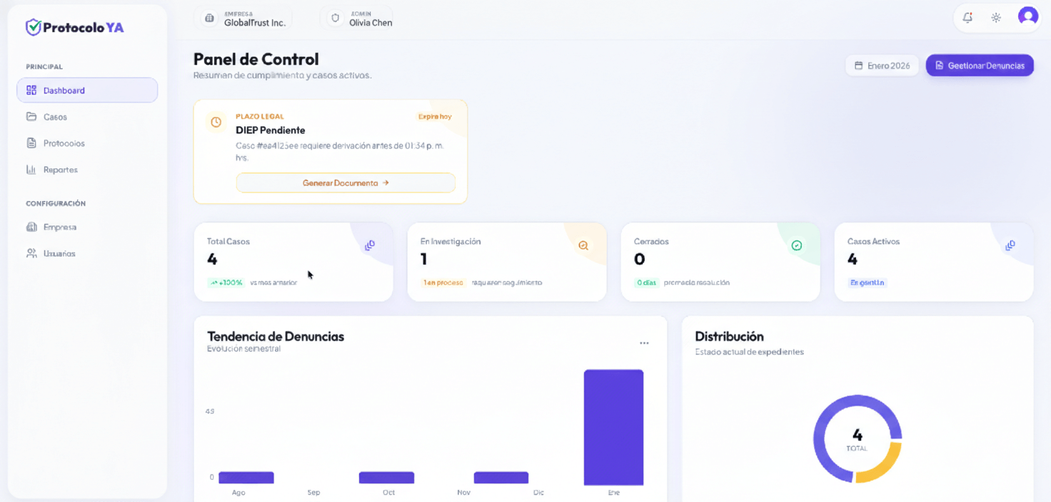 Por una tarifa plana de $100.000 al año, obtén tu Canal de Denuncias, Protocolos Legales y Gestión de Investigaciones. Cumple con la Ley 21.643 y la Ley de Datos sin complicaciones.